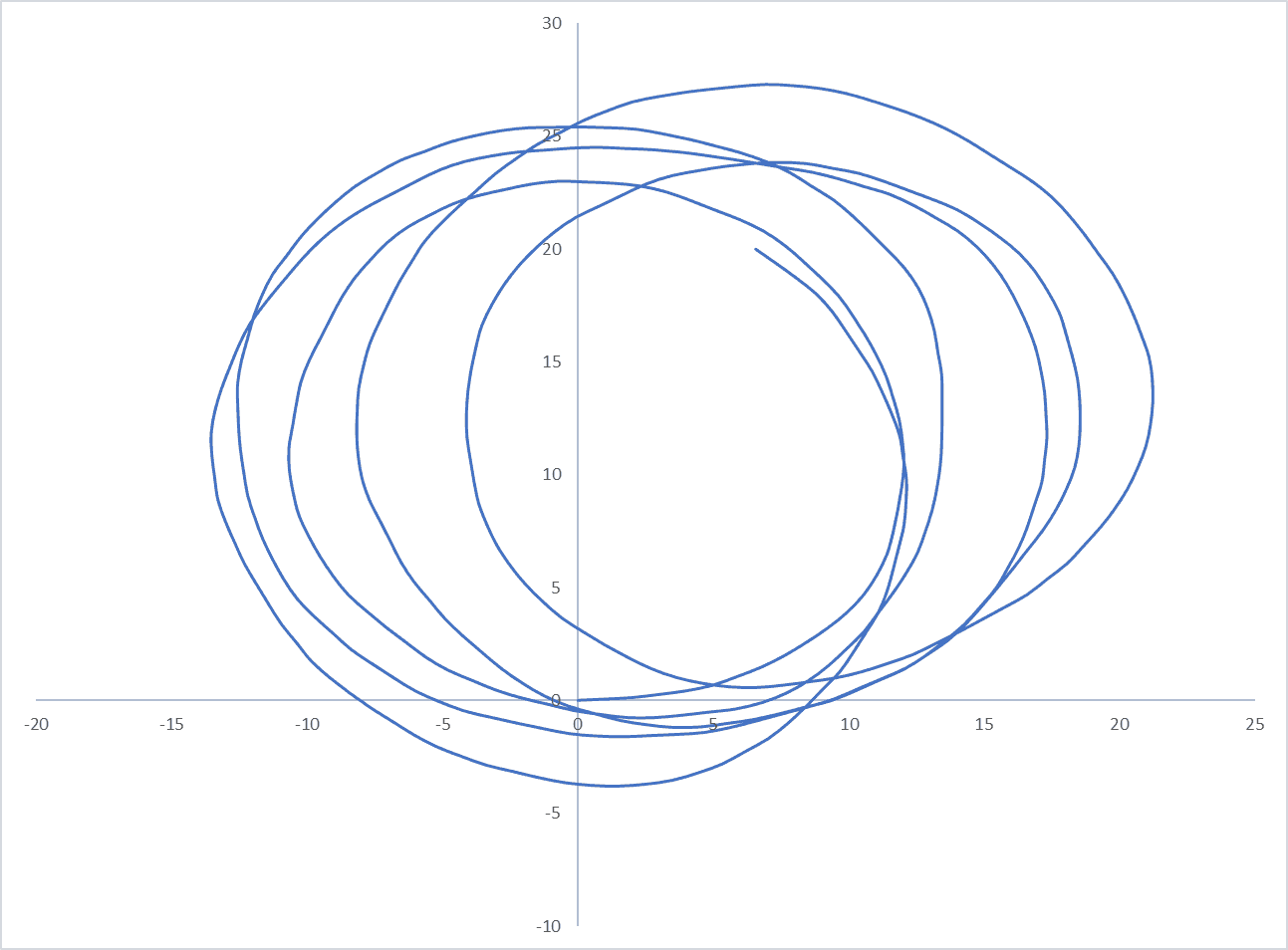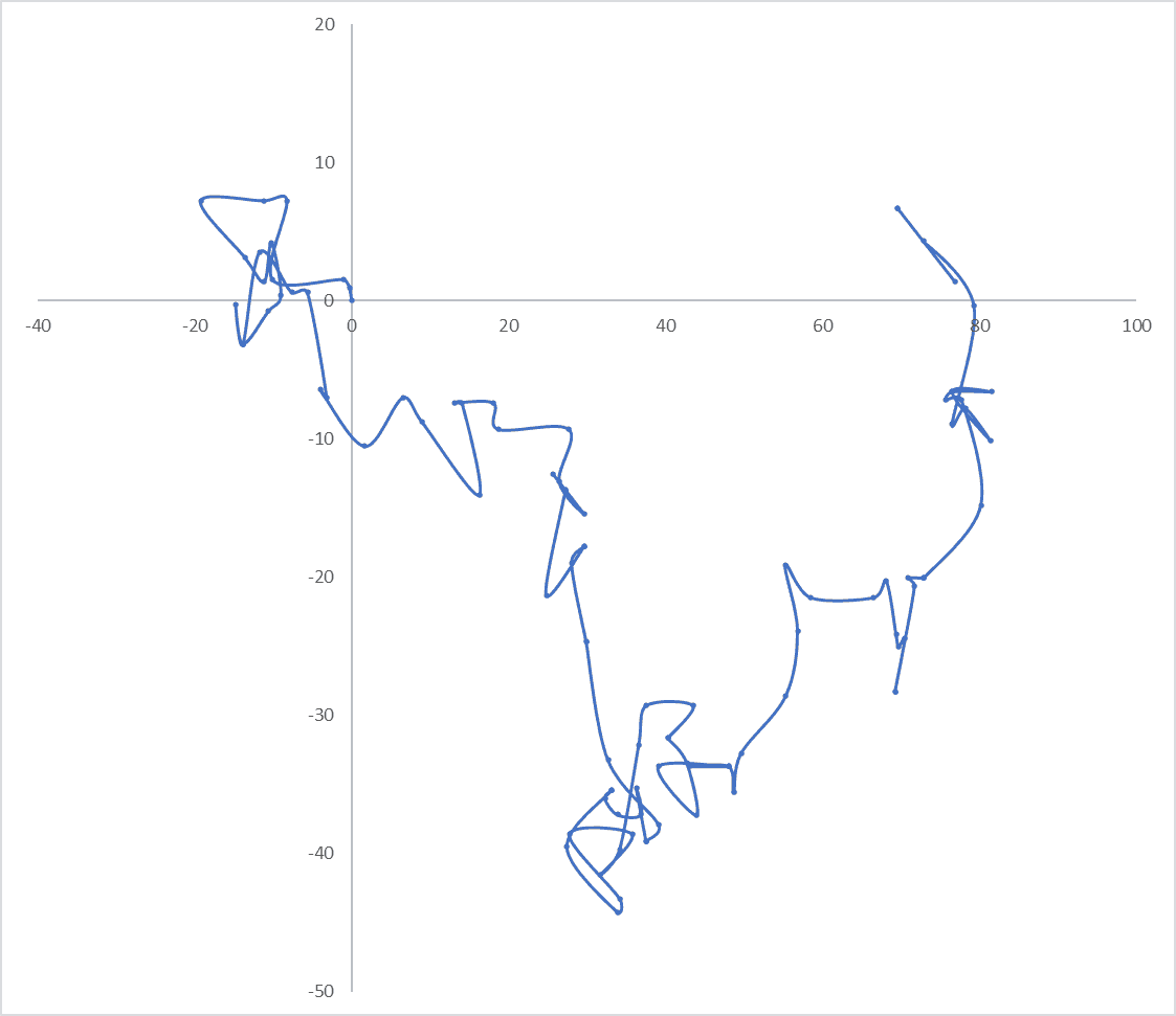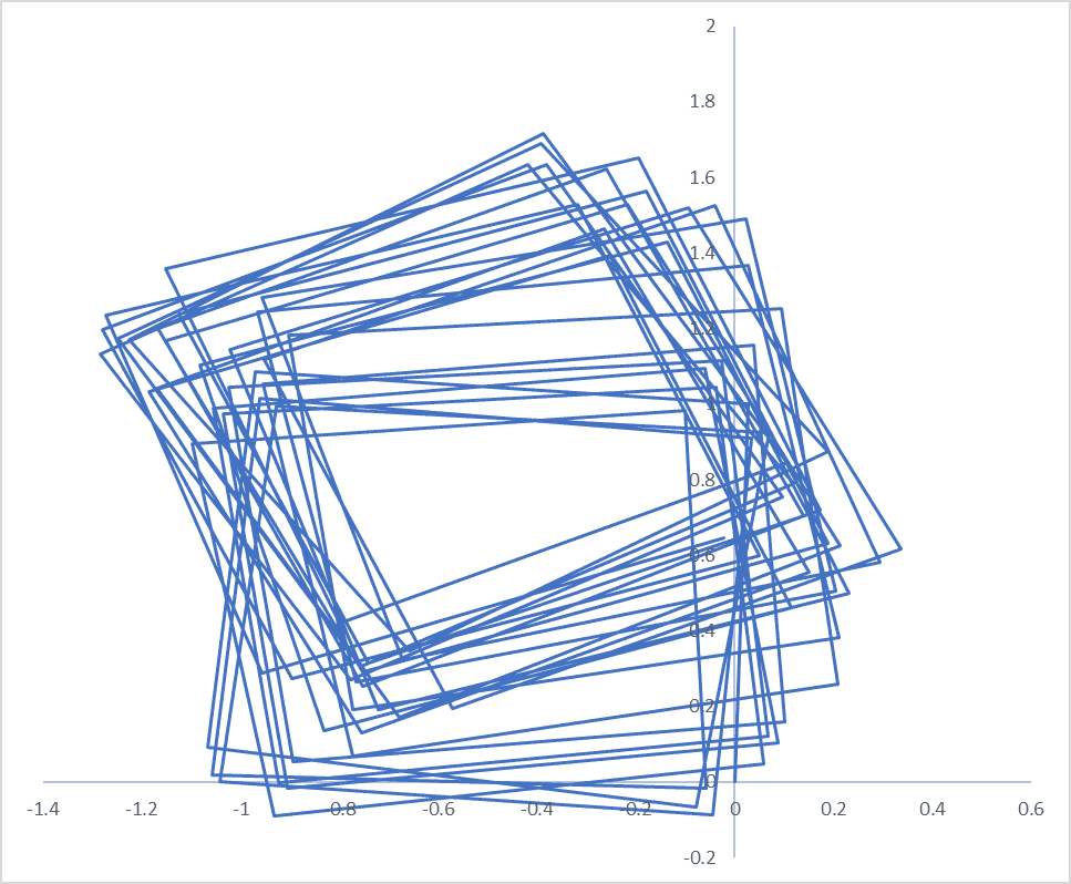 6To samo, ale zamiast zakręcać cały czas w tę samą stronę znormalizujemy teraz kierunki (czyli odejmiemy od każdej cyfry 4.5 zanim przekształcimy ją na radiany). Ponadto znacznie zwiększymy ilość punktów wykresu (do około 10K), bo w początkowych stadiach niewiele się dzieje: