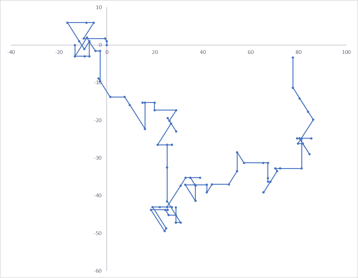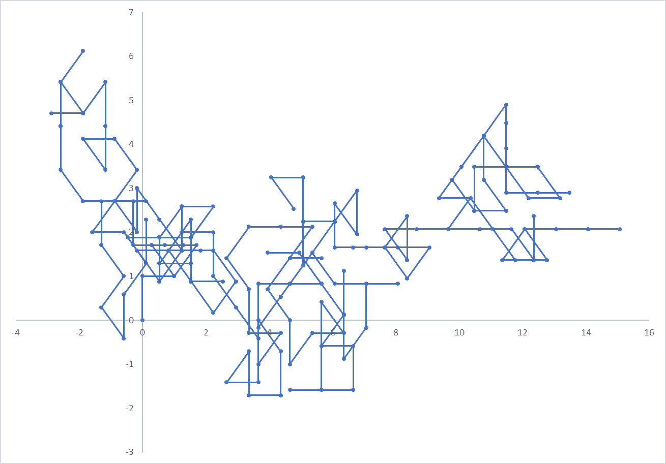 1Zaczniemy od wariantu najprostszego: startując od punktu (0,0) będziemy dodawać współrzędne z poprzedniego kroku do kolejnych cyfr Pi (nieparzyste na iksach, parzyste na igrekach). Innymi słowy najkrótszy możliwy krok wynosi 0 (jeżeli pojawią się dwa kolejne zera obok siebie), a najdłuższy - około 12.7 (przekątna kwadratu 9x9). Droga zawsze idzie w górę i w prawo, jest więc raczej nudno: