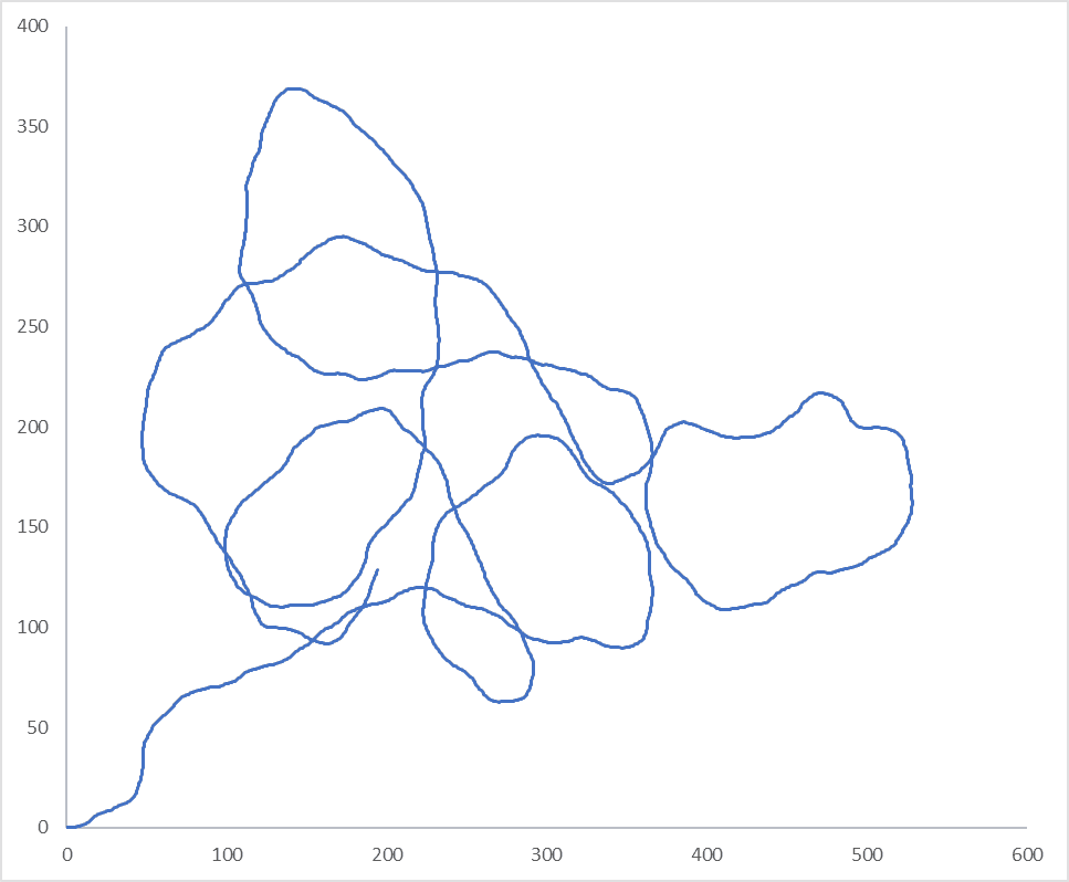 2Wprowadźmy kąt, o jaki będziemy zakręcać za każdym razem. W tym celu dzielimy liczbę Pi na segmenty dwucyfrowe, następnie z każdego segmentu bierzemy pierwszą cyfrę do wyliczenia kąta zakrętu (normalizujemy ją do kąta pełnego, a więc 0 oznacza brak zakrętu, jedynka - zakręt o 36 stopni, dwójka - o 72 stopnie i tak dalej aż do dziewiątki oznaczającej zakręt o 324 stopnie), a druga mówi nam o ile się przemieszczamy. Efekt jest już nieco ciekawszy: