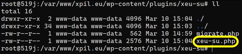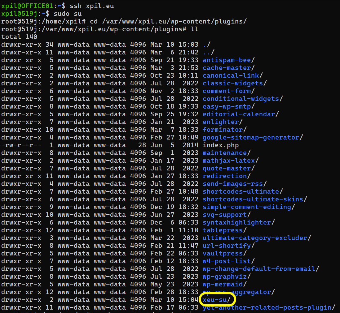Then, we open the terminal and log in via SSH to our blog. We go to the plugins folder and create a new folder. We come up with the name ourselves - it will be the name of our plugin. In my case, it's xeu-su ("xeu" from "xpil.eu" and "su" for "short url"):