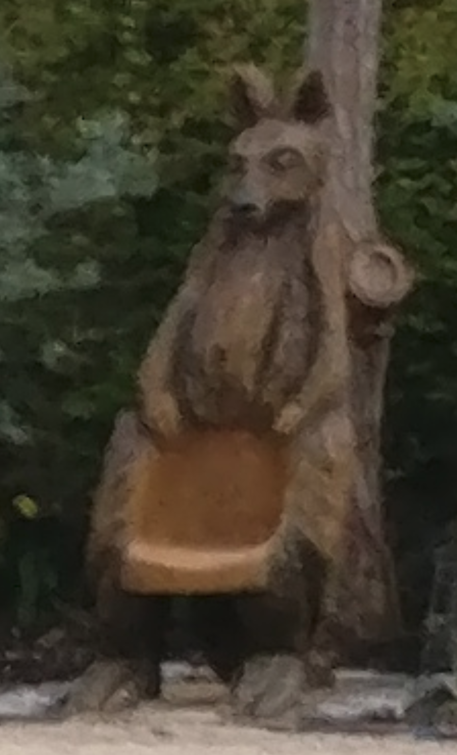 Przepraszam za jakość, ale to jest zbliżenie z większej całości, której tu nie załączę bo próbuję ciągle jeszcze zachować jakieś resztki prywatności. Żwiezę jest drzeźwiane (wyrzeźbione z drzewna). W części brzuszno-podbrzusznej znajduje się ławeczka dla turystów, do pstrykania fotek. Na mój gust to to jest jakiś wychudzony dźwiedź albo może kangur, którego ktoś kupił w Ikei i poskładał bez patrzenia w instrukcję. Właściwie to nie wiadomo.