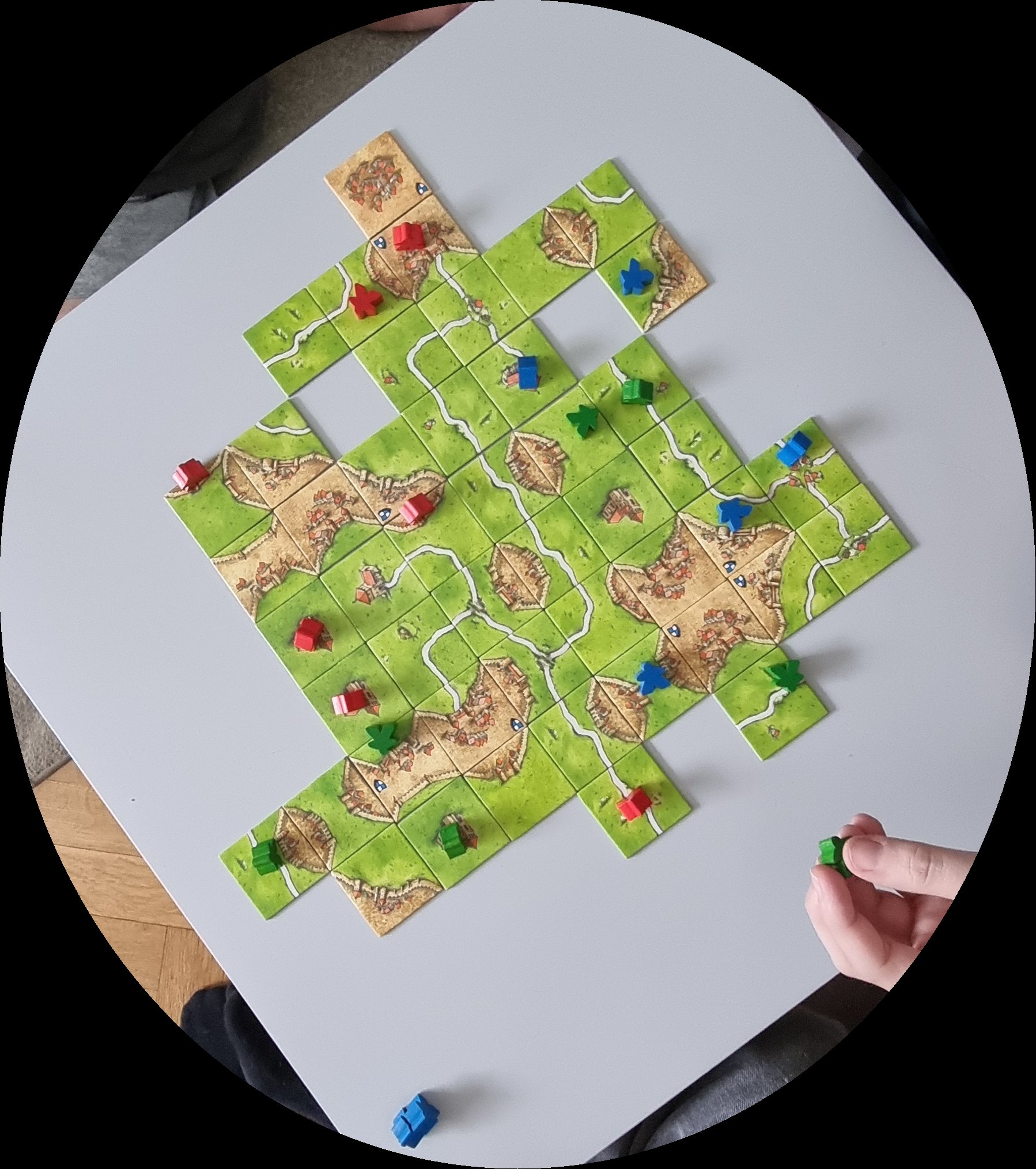 Następnie może (ale nie musi) dołożyć na tę płytkę, którą właśnie wyłożył, swojego ludzika. Przy czym musi być jasne, czy ludzik stoi na drodze, w mieście, czy leży na łące.