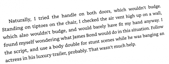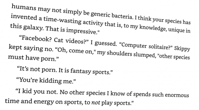 Najpiękniejsze jednak w tej książce jest to, że w okolicach połowy główny bohater (i jedyny narrator, chwała za liniową narrację!) natrafia na...