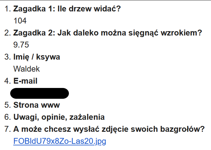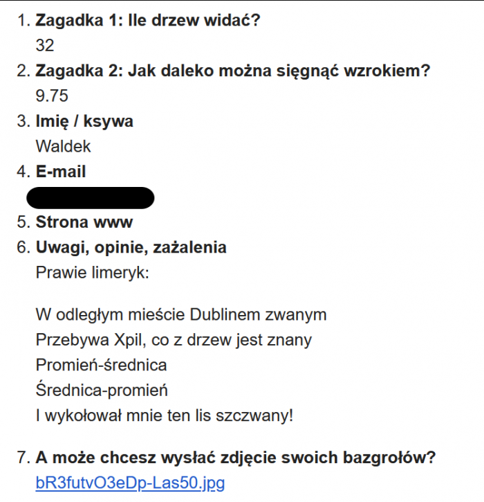 2Jako drugi, dla odmiany, odezwał się również Waldek - tym razem obydwa rozwiązania poprawne. Bonusik - Waldek wysyłał odpowiedź podczas nagłego ataku weny Tfurczej, więc poza matematyką mamy też odrobinę poezji, z której wnioskuję, że poprzednia odpowiedź na pierwszą część zagadki była prawidłowa przy założeniu, że 0.25 to średnica drzewa a nie promień.