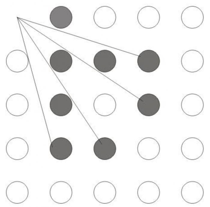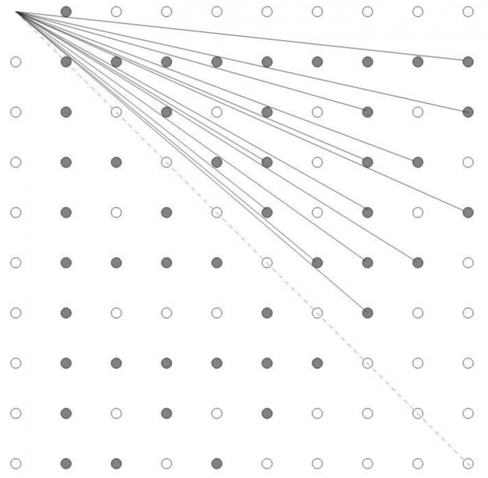 Oczywiście zamiast patrzeć dookoła, skupiłem się tylko na pierwszej ćwiartce układu, bo wiadomo, symetria. Widać siedem kółek o współrzędnych dodatnich oraz dwa leżące na osiach. Rozciągając to na pozostałe trzy ćwiartki widać, że łącznie widać będzie 32 drzewa i to jest prawidłowa odpowiedź do pierwszej części zagadki.