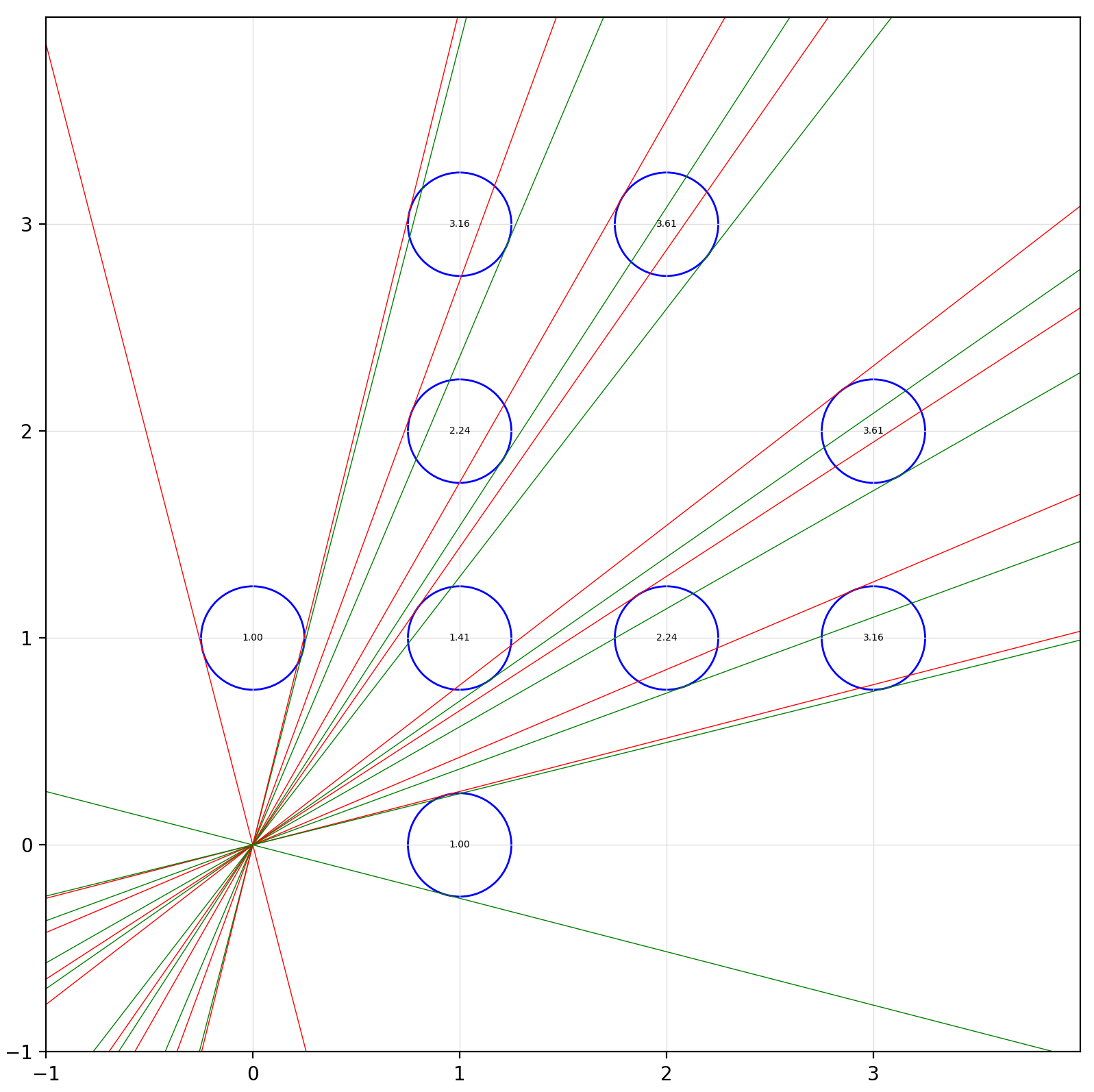 Pierwsza część zagadki jest na tyle prosta, że można ją rozwiązać za pomocą kartki A4, linijki, cyrkla i ołówka. Ja jestem na tyle leniwy, że - jakże by inaczej - napisałem sobie w Pythonie funkcję, która dla zadanego koła rysuje owo koło oraz dwie styczne doń, przechodzące przez (0,0). Dzięki temu mogłem sobie wirtualnie kombinować z różnymi ustawieniami drzew.