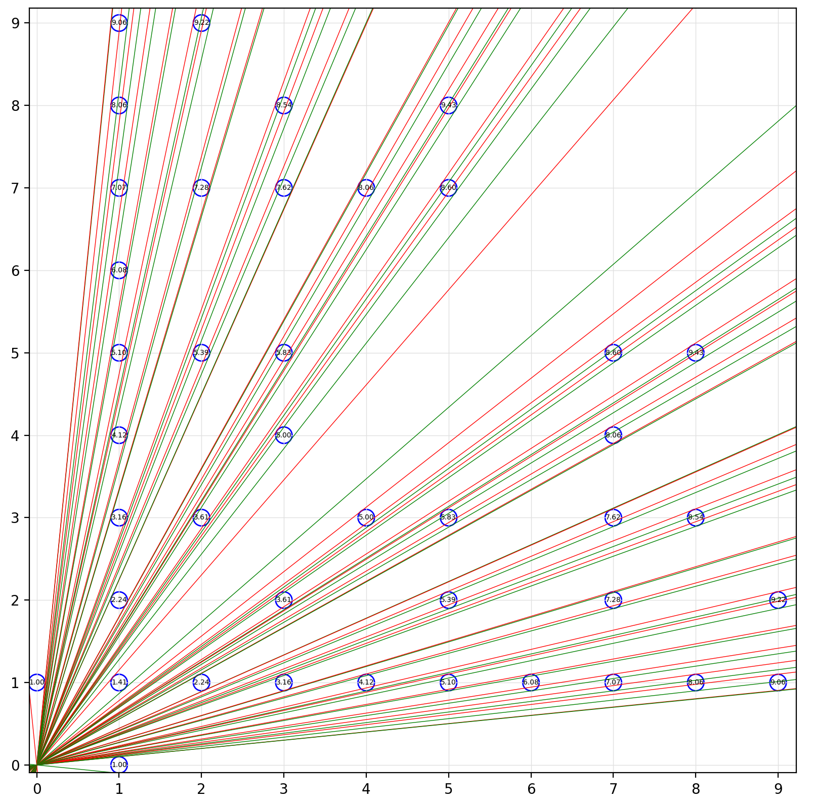 Na pierwszy rzut oka wydaje się, że rozwiązanie to 9.33 metrów (drzewo (5,8)). Jednak po uważniejszym przyjrzeniu się zauważamy co dzieje się między drzewami (2,1) oraz (7,3) - otóż okazuje się, że nie pokrywają one całego kąta i między nimi jest maleńka szczelina, przez którą widać drzewo (9,4). Widać co prawda bardzo wąski pasek tego drzewa - ale jednak widać. Żeby nie było wątpliwości, oto zbliżenie na punkt (9,4):