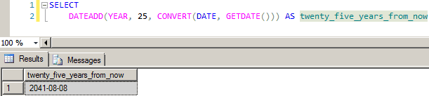 Things get even more charming when it comes to years. As expected, if we want to get a date, let's say,  25 years from now, we will use the same DATEADD operator in SQL Server: