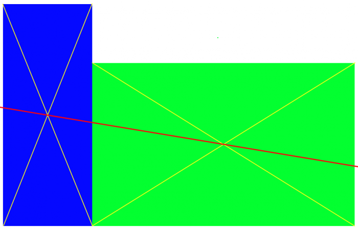 1Wyznaczyć środek każdego z nich (przecięcie przekątnych) i poprowadzić linię przez te dwa środki - tym samym dzielimy obydwa prostokąty na pół, suma połówek będzie połową powierzchni całej figury. Przykład: