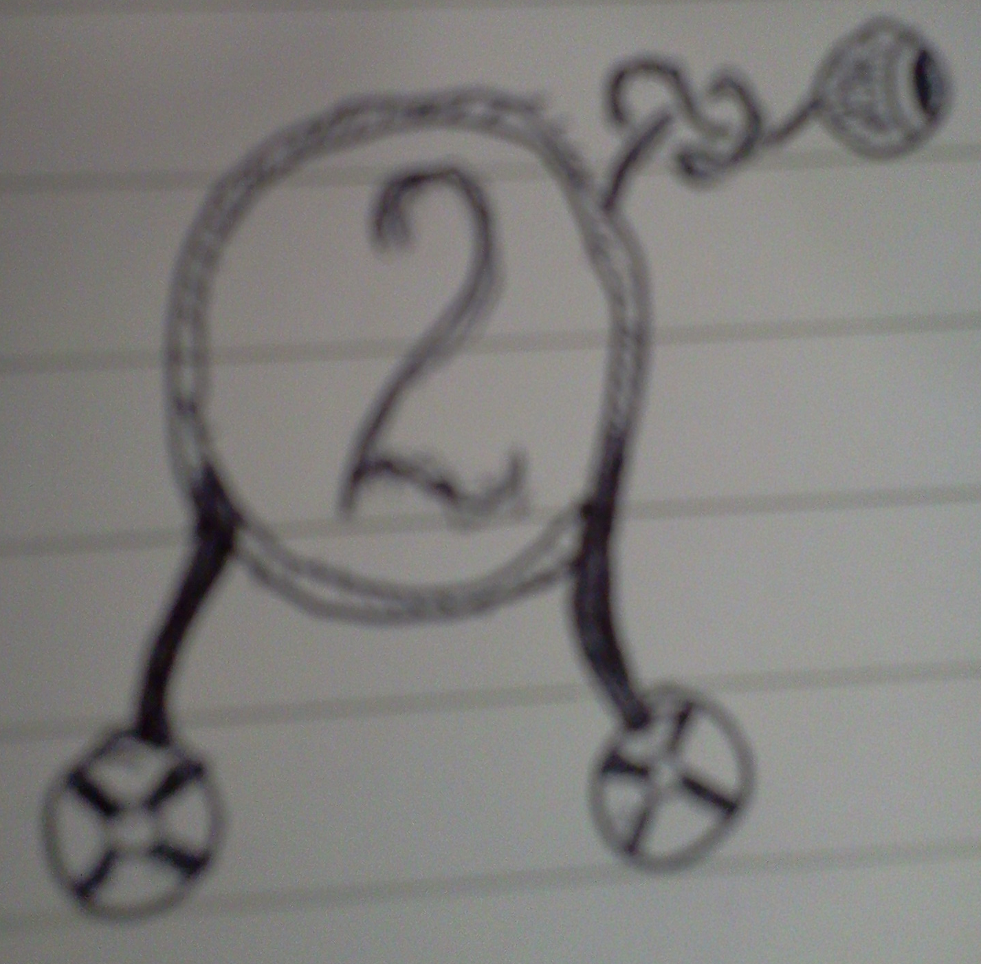 Zaczęło się od dwójki. Potem, dla lepszej widoczności, a także dla poprawy bezpieczeństwa, wziąłem dwójkę w kółko. Następnie dorysowałem jej dwie żeliwne nóżki, jednak strasznie marudziła, że nie umie chodzić, a chciałaby móc się przemieszczać. No to bach bach, dorysowałem kółka. Efekt był niezły, jeździła sobie po całej sali konferencyjnej (ku uciesze znudzonych uczestników spotkania), jednak ciągle o coś zahaczała. Ostatnim wysiłkiem dorysowałem jej więc oko - w czasie rysowania musiałem niestety tego oka dotykać końcem długopisu, i trochę mi ono uciekało, więc nie obyło się bez supełka - końcem końców jednak oko powstało i dwójka jeździ sobie teraz w kółku, na swoich żeliwnych nóżkach, i jest szczęśliwa.