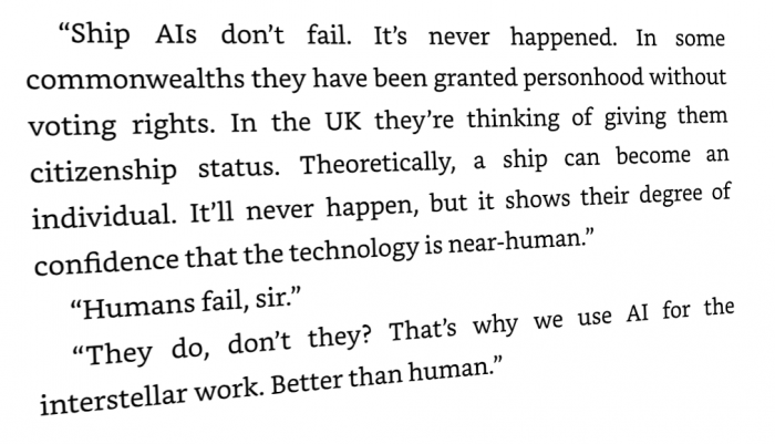 In the opening paragraphs we meet Michelle, who had dreamed of being an astronaut since her childhood. Her father went to the stars, and she wants it too. From an early age she tries to do everything she can to get her interstellar pilot credentials - and eventually she succeeds. The only trouble is that, in the meantime, artificial intelligence tech has improved to such an extent that now all space vehicles are piloted by machines, end-to-end. Human "boss" is only needed because of regulations, sitting comfortably in his chair and doing nothing most of the time. The information that AIs don't malfunction is repeated several times so it's obvious that it will be Michelle who gets on a first rocket with AI failure.