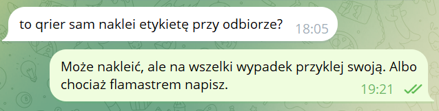 Jak już dostał paczkę, zamówiłem kuriera. Kurier na tyle ogarnięty, że zawsze przyjeżdża z gotową etykietą adresową, więc nawet nie trzeba adresować paczki. Ja jednak dla pewności zawsze adresuję paczkę własnoręcznie. Tak też poradziłem kumplowi: niech naklei swoją etykietę, albo chociaż flamastrem napisze: