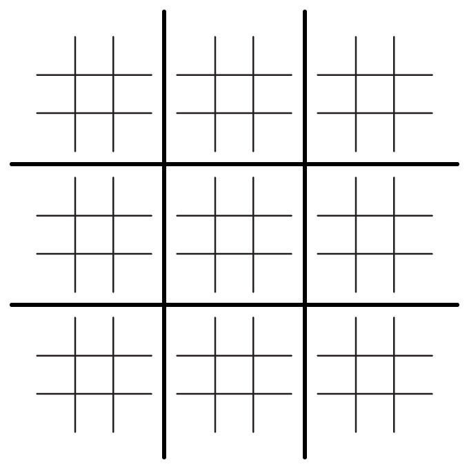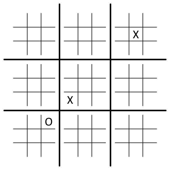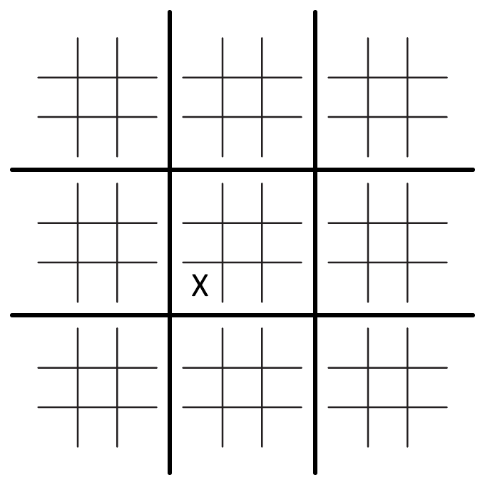 Pierwszy z dwóch graczy stawia swój krzyżyk w jednym z 81 pól. Na przykład... tutaj: