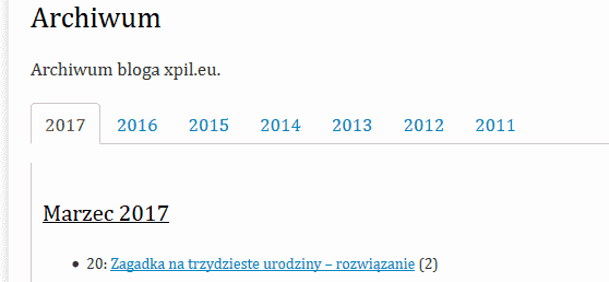 Póki co archiwum jest zorganizowane w zakładki - jedna zakładka dla każdego roku, szczegółowa lista wpisów w każdej zakładce, pogrupowana według miesięcy. A nawiasie przy każdym wpisie ilość komentarzy. Jak mi się zachce, mogę przeorganizować to archiwum i na przykład dodać sekcję z najpopularniejszymi wpisami, albo według kategorii czy ilości komentarzy. Są różne opcje.