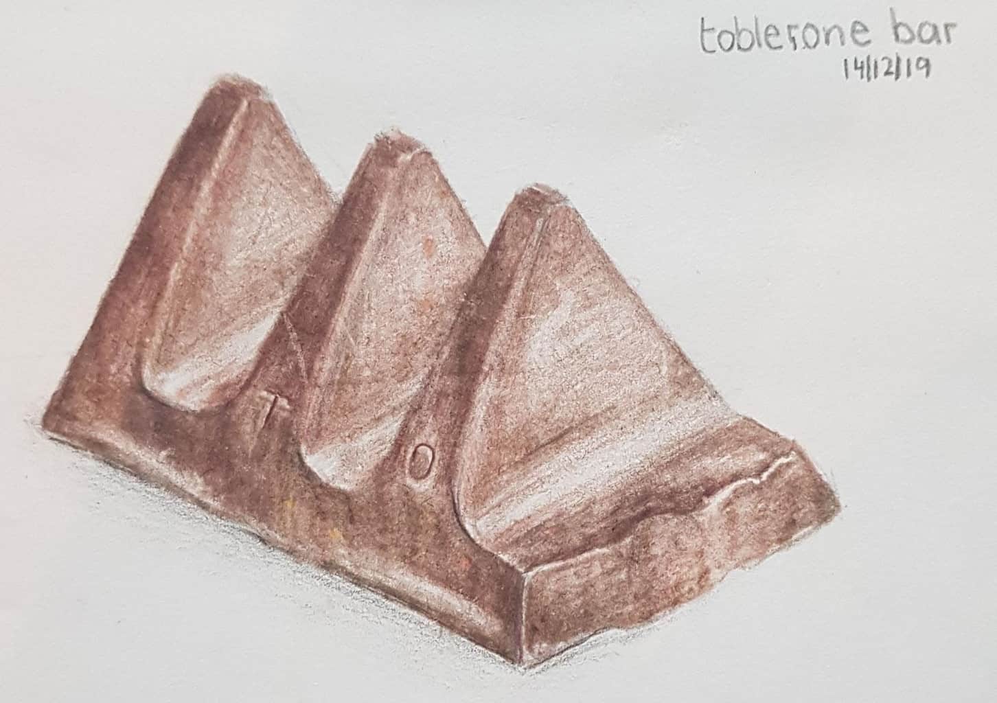 Kawałek czekolady marki Toblerone, narysowany kredką.