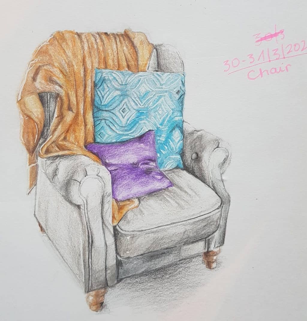 Gdyby mi kazali narysować fotel, wyglądałby jak kolonia patyczaków. Młoda jednak stanęła na wysokości zadania - efekt poniżej. Kredki. Marzec 2020.