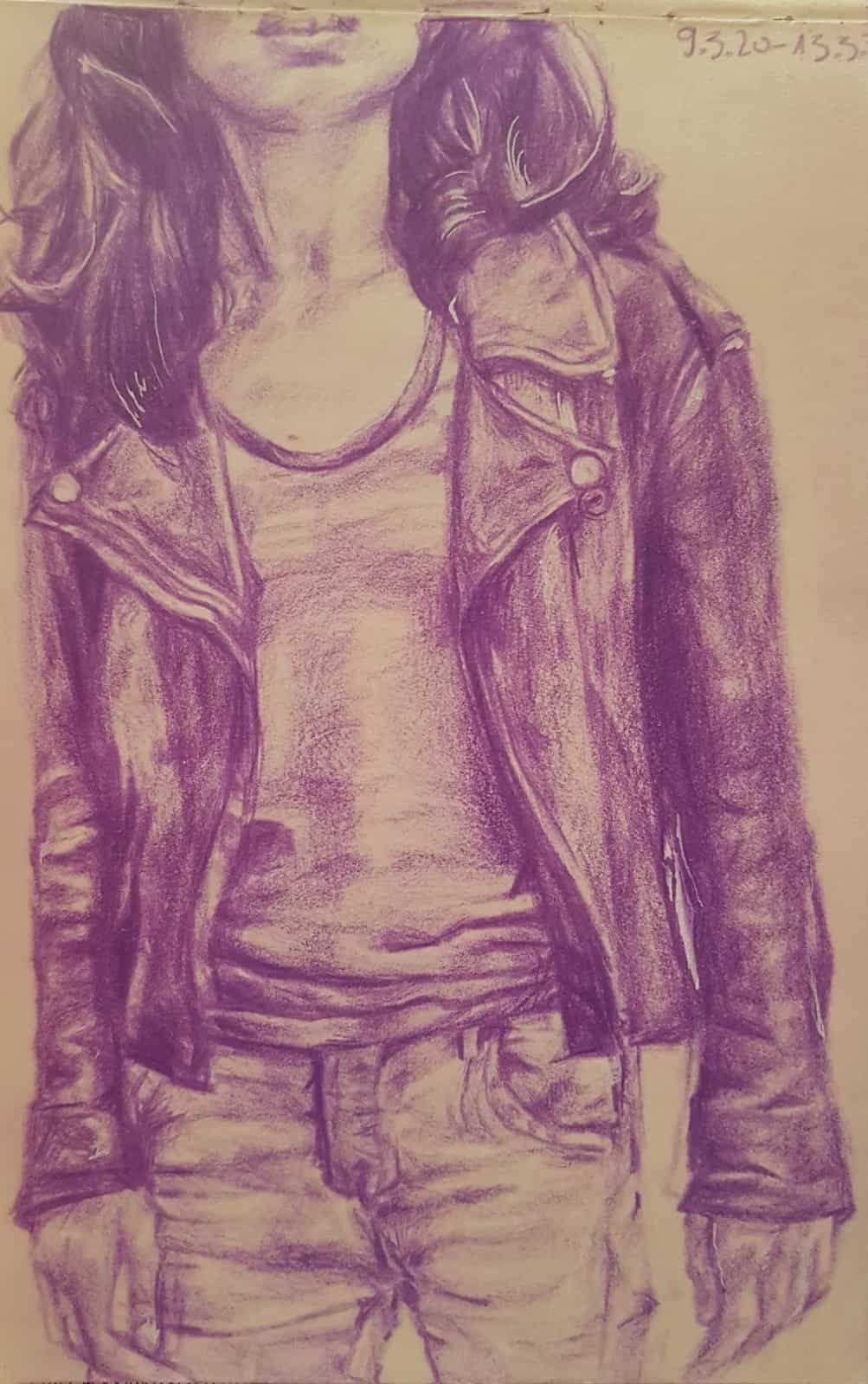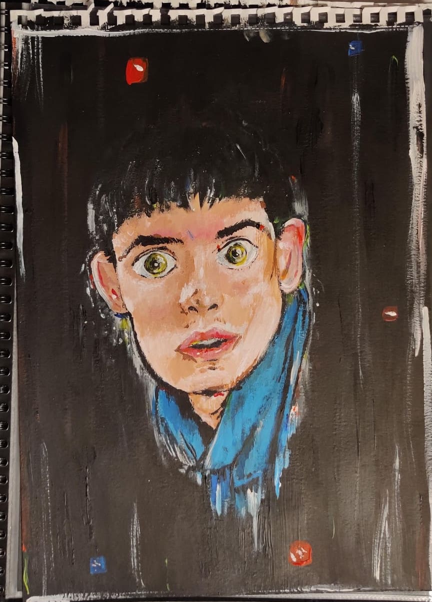 Młoda lubi "Merlina". Wzięła klatkę z filmu i namalowała ją po swojemu. Farby akrylowe.  Styczeń 2020.