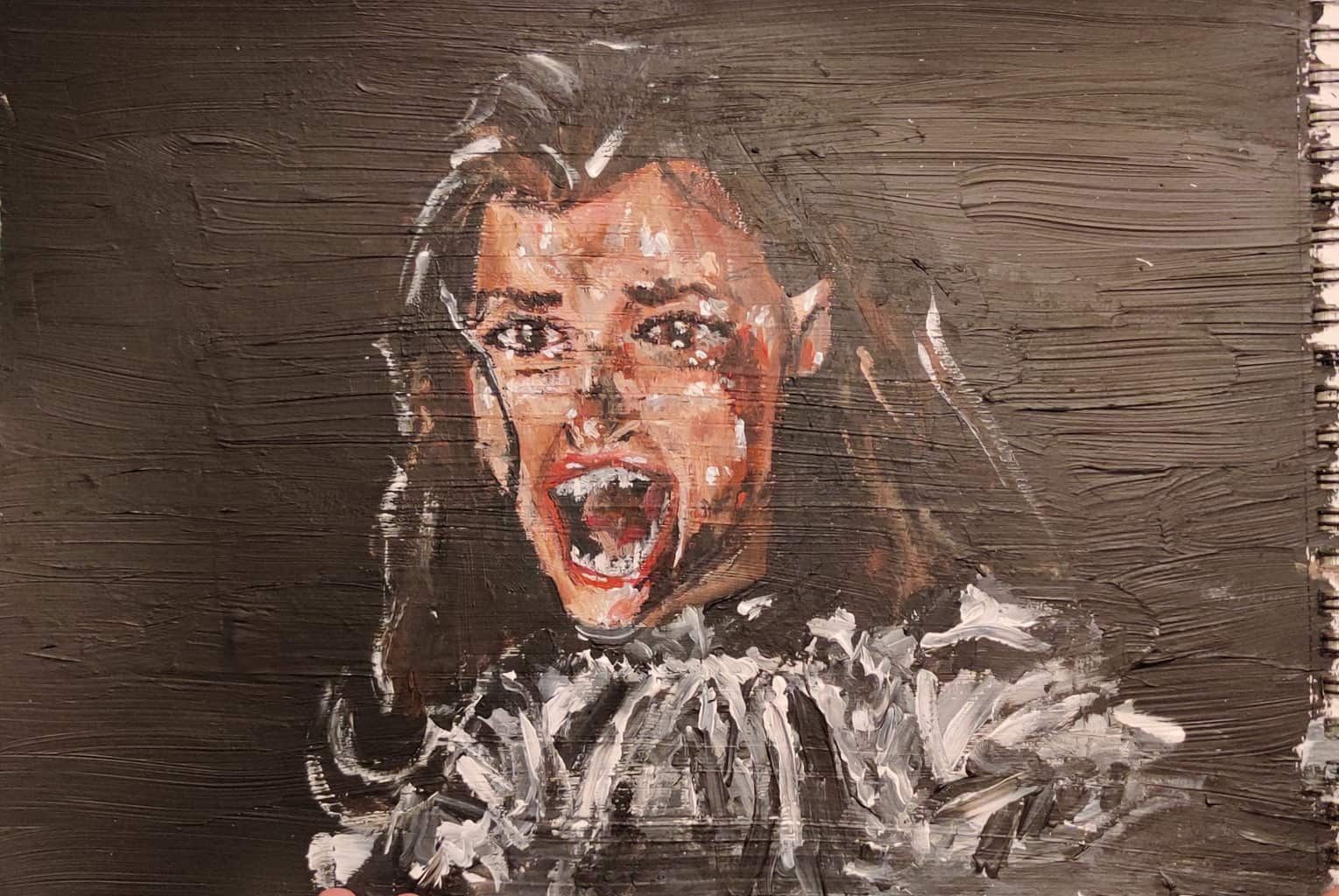 Kolejne dzieło Młodej - tym razem farbami. Styczeń 2020. Kadr z "Wiedźmina". Yennefer. Farba akrylowa, grubo nakładana. Ciarki mnie przechodzą za każdym razem kiedy na to patrzę.