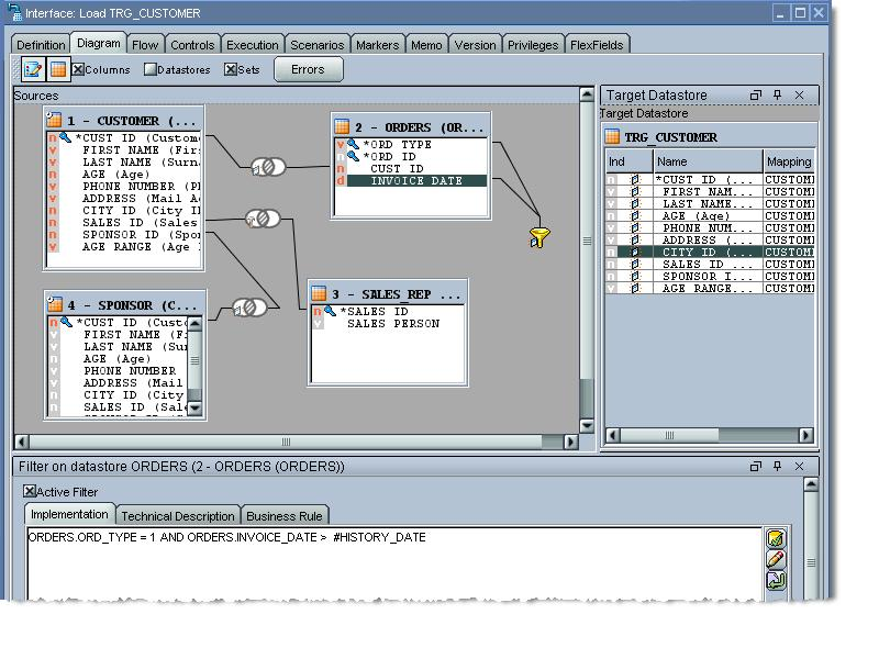 Jak każde narzędzie do pompowania danych z miasta A do miasta B, ODI umożliwia mapowanie kolumn źródłowych na kolumny docelowe. Niestety, w odróżnieniu od takiego na przykład SSIS, tutaj nie mamy możliwości zadania dowolnego zapytania źródłowego w postaci SQL, i nawet najbardziej złożoną logikę musimy zaimplementować na piechotę, przeciągając tabele i tworząc wszystkie JOIN-y, filtry i formuły sposobem myszowym. Można to oczywiście w niektórych przypadkach obejść zapisując zapytanie SQL u źródełka w postaci widoku, ale to jednak nie to samo, bo wymaga specjalnych uprawnień po stronie systemu źródłowego, których czasem nie mamy.