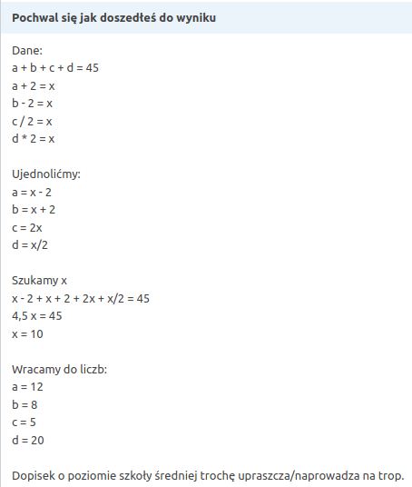 Układ czterech równań z czterema niewiadomymi, kaszka z mleczkiem: https://www.wolframalpha.com/input/?i=a%2Bb%2Bc%2Bd%3D45%2C+a%2B2%3Db-2%2C+a%2B2%3Dc%2F2%2C+a%2B2%3D2d