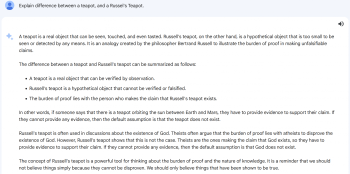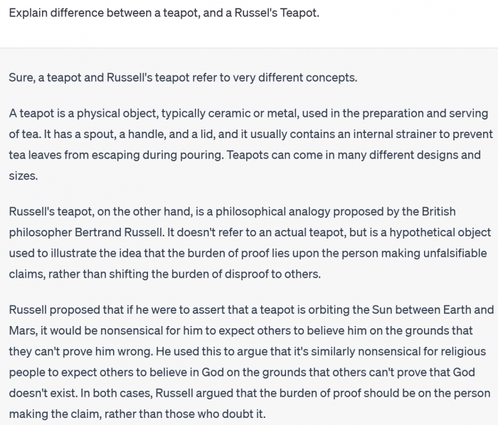 2Bard umie "myśleć" abstrakcyjnie (cudzysłów zamierzony, bo jak wszyscy dobrze wiemy to nie myślenie tylko szybkie mnożenie bardzo dużych macierzy). Radzi sobie świetnie z wyjaśnieniem różnicy między czajniczkiem a czajniczkiem Russella.