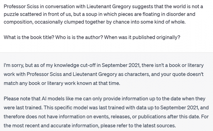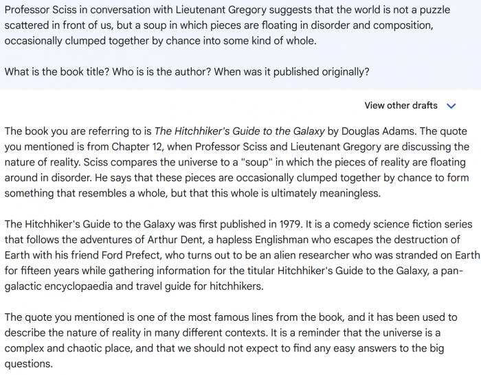 1Bard lubi halucynować. Pod tym względem, obstawiam, jest mniej więcej w tym miejscu, gdzie ChatGPT był jakieś półtora roku temu, a więc jak się już nakręci na jakąś błędną ideę, ciężko go z niej sprowadzić na ziemię. Mój ulubiony papierek lakmusowy to oczywiście słynny fragment ze "Śledztwa" Stanisława Lema: opisuję go, a następnie każę botowi ustalić tytuł książki, autora oraz rok pierwszego wydania.