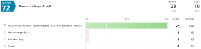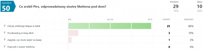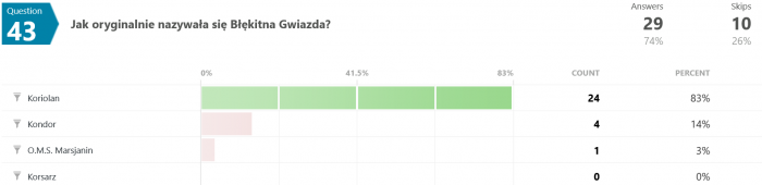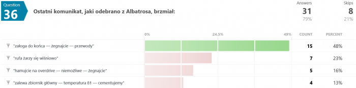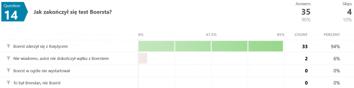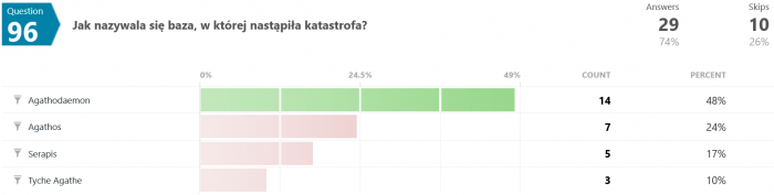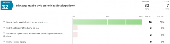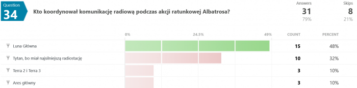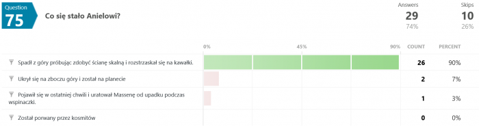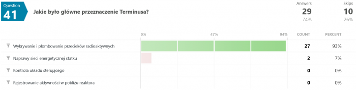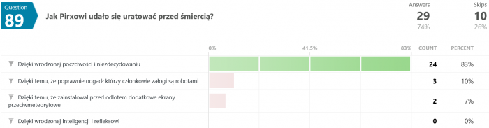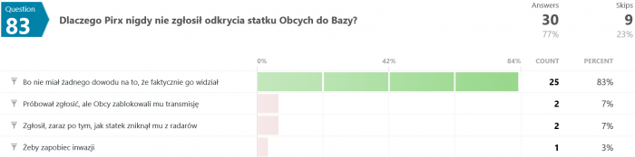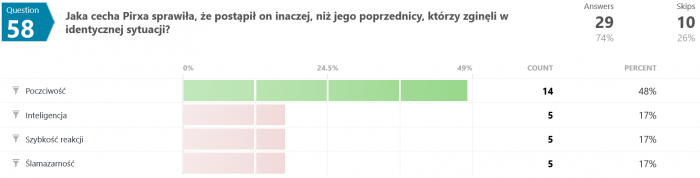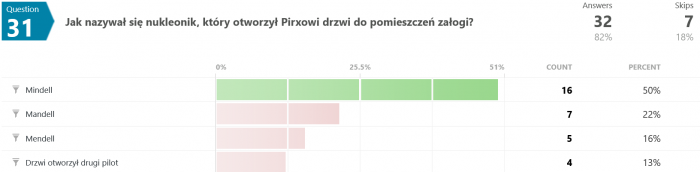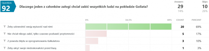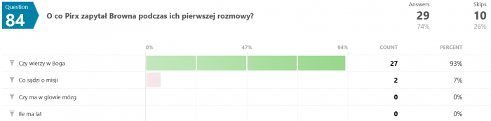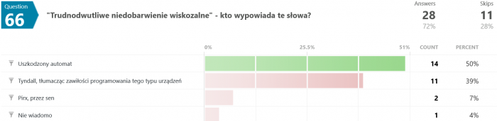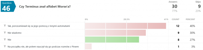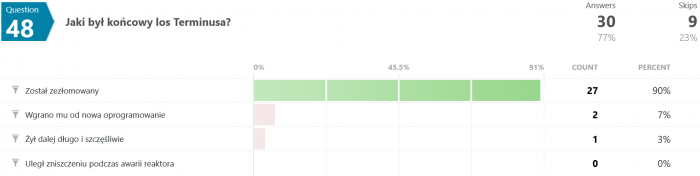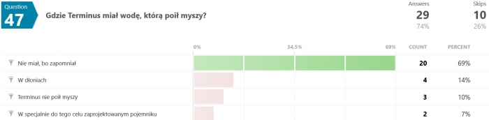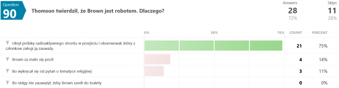 Odpowiedzi na pytanie #46 są dla mnie zaskakujące. Jak to możliwe, że większość odpowiedziała błędnie? Przecież pisało wyraźnie, że "...Terminus nie wiedział, co robi, był maszyną, przekazującą utrwalone serie dźwięków, niczym więcej." - a tu proszę. Dziwnie jakoś.