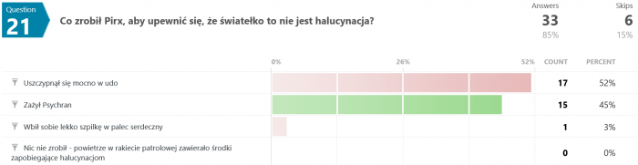 Aż 18 odpowiedzi błędnych, a tylko 15 prawidłowych. A przecież nietrudno zapamiętać: "Pilot Pirx wsadził rękę do zewnętrznej kieszeni w obudowie fotela, wydobył stamtąd mały flakonik, wsadził sobie do nosa jego dwie szklane rureczki i pociągnął, aż oczy zaszły mu łzami. Psychran przerywał podobno nawet kataleptyczne stany jogów i widzenia świętych pańskich."