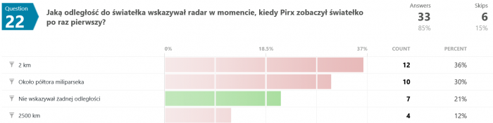 Większość odpowiedziała 2km - owszem, taką odległość wskazał potem przyrząd oparty na pryzmatach i soczewkach, jednak radar nie pokazał niczego. Nota bene ten motyw to jedno z niewielu potknięć Mistrza - skoro światełko tak naprawdę było efektem błędu aparatury, to ten optyczny przyrząd też nie powienien był niczego pokazać. No ale przymknijmy oko.