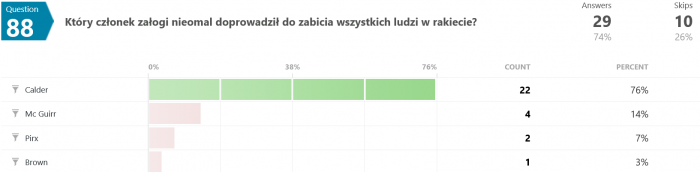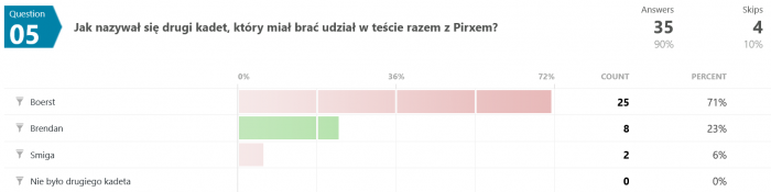 Na pierwsze cztery pytania większość odpowiadała poprawnie. Piąte było podchwytliwe i dużo ludzi dało się złapać. Z Pirxem miał lecieć rzecz jasna Brendan, ale się w ostaniej chwili rozchorował i wstawili na jego miejsce Boersta.