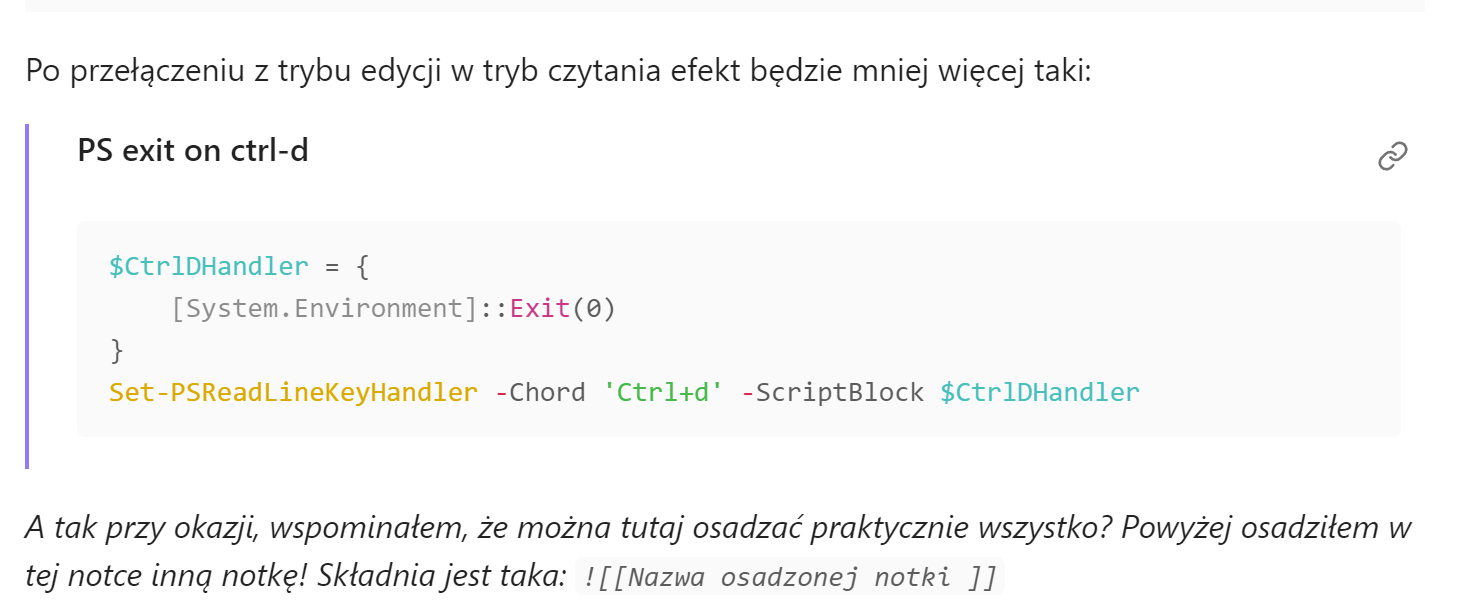 Nota bene, jeżeli ktoś jest zainteresowany osadzaniem w notce Obsidian innej notki z tego samego sejfu, składnia jest następująca: ![[Tytuł osadzanej notki]]. A efekt jest taki, jak na poniższym zrzucie ekranu, zrobionym z notki, którą treningowo wykonałem w ramach przygotowywania niniejszego wpisu: