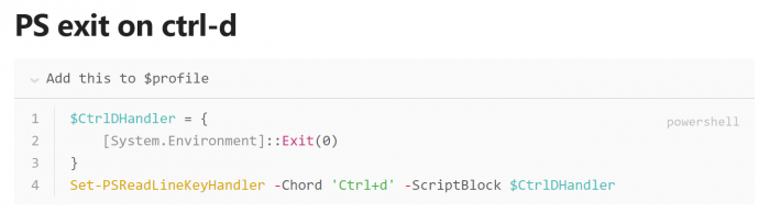 Aha, a jeżeli ktoś szuka sposobu na zmuszenie sesji Powershell żeby się zakończyła po wciśnięciu Ctrl-D (tak, jak robi to większość klamotów linuksowych), to trick można ukraść z tego zielonego prostokąta powyżej.