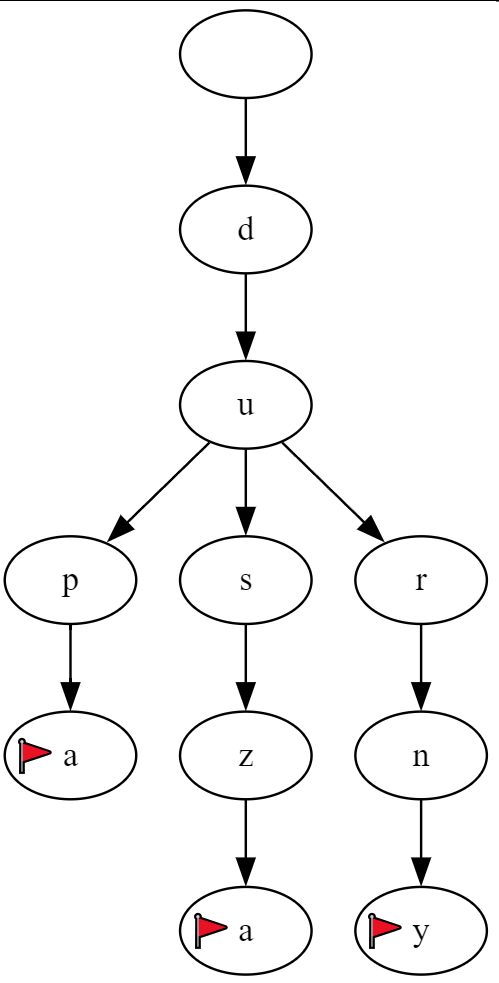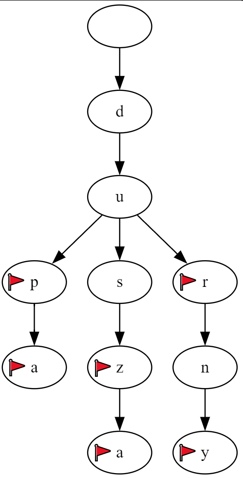 Flagi oznaczają końcówki słów. Oczywiście kompletny słownik będzie również zawierał odmiany oraz inne słowa, więc powyższy fragment drzewa wyglądałby faktycznie tak: