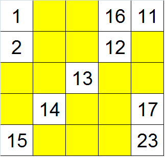 2. Suma liczb w każdym wierszu, każdej kolumnie oraz na obydwu przekątnych jest taka sama. W tym przypadku sumą tą jest 65, co wiemy stąd, że jedna z przekątnych jest już wypełniona. Ponadto, nawet jeżeli nie mielibyśmy do dyspozycji jednej pełnej przekątnej (czy też wiersza bądź kolumny), liczbę 65 łatwo wyznaczyć jako pięciokrotność środkowego elementu (środkowego czyli znajdującego się dokładnie pośrodku między liczbami 1 a 25). Elementem tym jest 13, 135=65.*