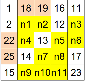 Poniżej kwadrat z wpisanymi liczbami 22, 25, 18 i 19. Ponadto, pustym komórkom przypisałem zmienne ponumerowane od n1 do n11.