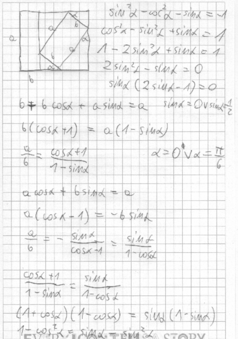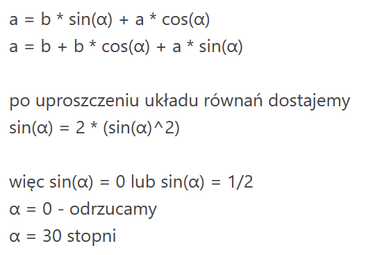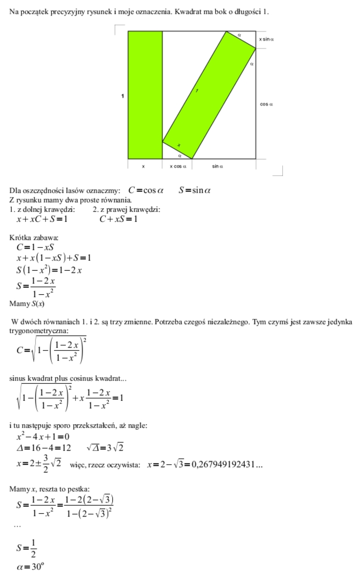 Można tu wykonać wiele akrobacji trygonometryczno - planimetrycznych i dojdzie się do wyniku po większych lub mniejszych przebojach. Jeżeli jednak ktoś zauważył, że przekątne obydwu prostokątów są do siebie równoległe...