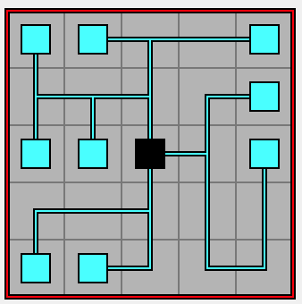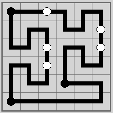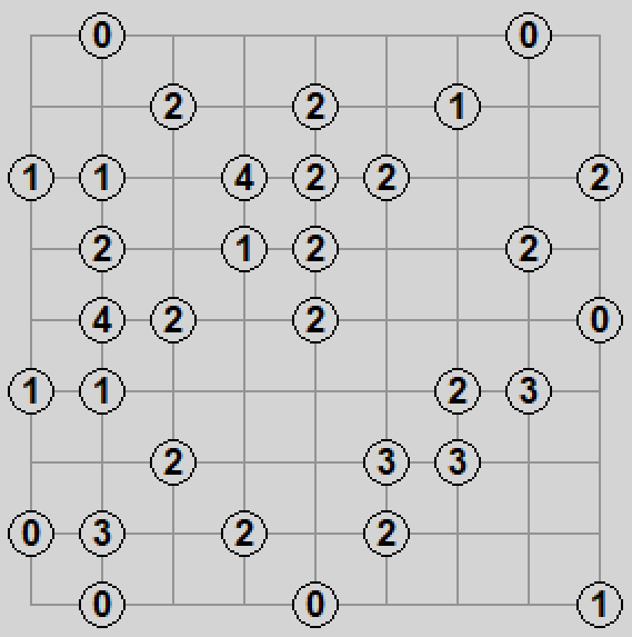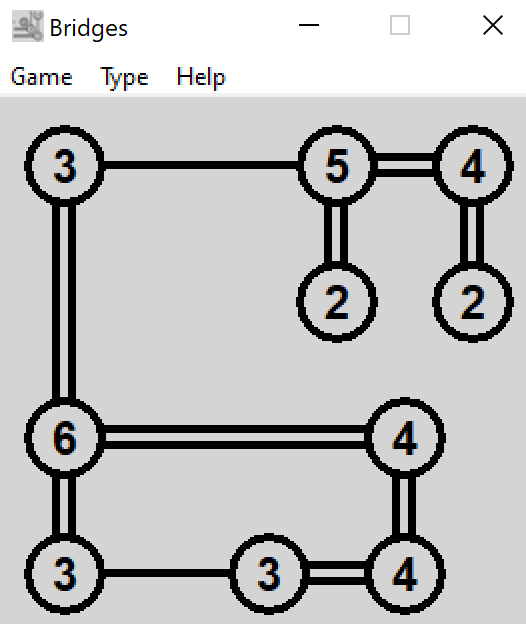 ... czyli po naszemu mosty. Na kwadratowej planszy umieszczono kilka kółek z liczbami w środku. Naszym zadaniem jest połączenie tych kulek poziomymi i pionowymi "mostami" czyli odcinkami prostymi tak, żeby do każdej kulki dochodziło tyle odcinków, ile wynosi jej numer. Od kulki w każdą z czterech stron mogą odchodzić maksymalnie dwa mosty (czyli osiem to maksimum).
