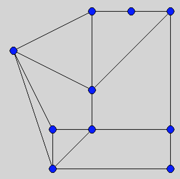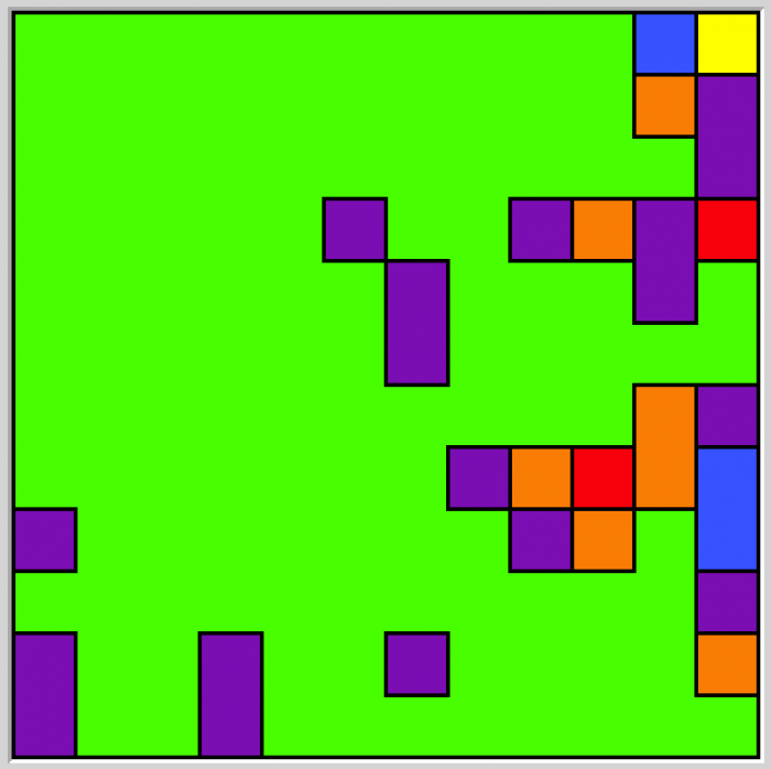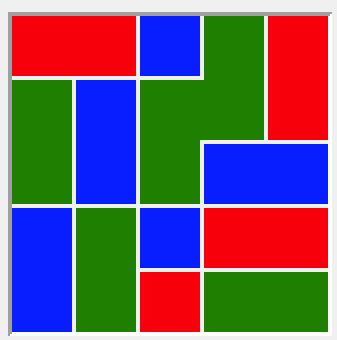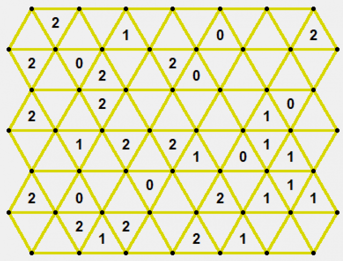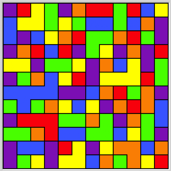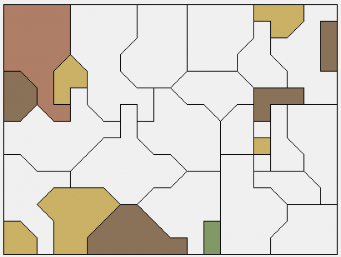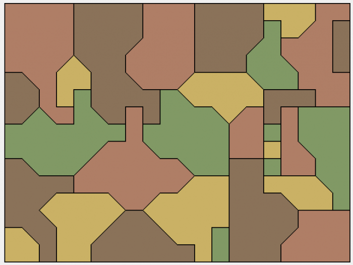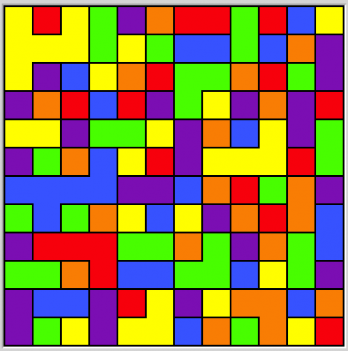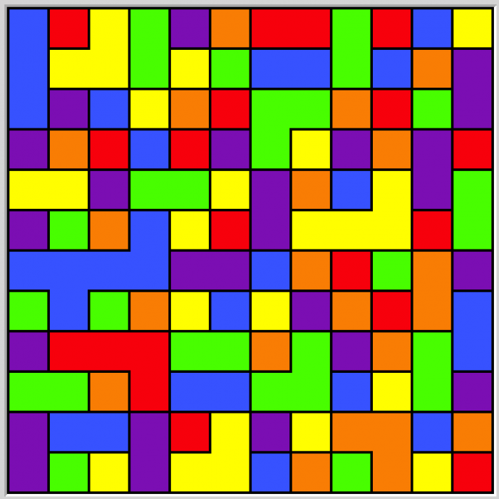 Kolorowanie mapy. Jak powszechnie wiadomo, każdą mapę na skończonej płaszczyźnie da się pokolorować maksymalnie czterema kolorami w taki sposób, żeby żadne dwa sąsiadujące obszary nie miały tego samego koloru ("sąsiadujące" to znaczy współdzielące niezerowy odcinek granicy - jeżeli dwa obszary współdzielą wyłącznie wierzhołek, mogą mieć ten sam kolor). Tutaj dostajemy losowo wygenerowaną mapkę; na dzień dobry niektóre obszary są już pokolorowane, naszym zadaniem jest ustalenie pozostałych kolorów.