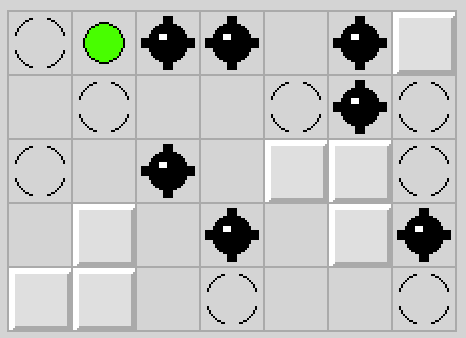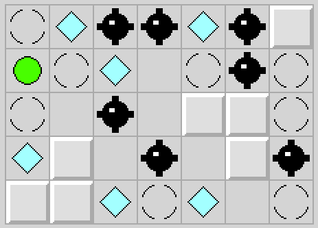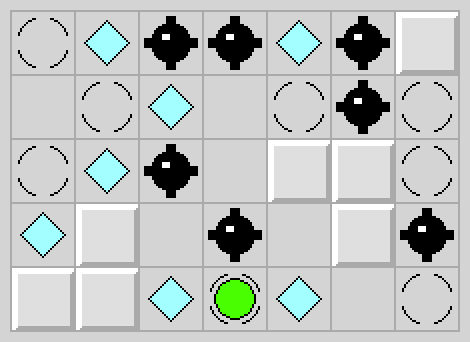 Gra z bardzo prostymi zasadami. Na prostokątnej planszy o kwadratowych polach (a to ci niespodzianka!) mamy umieszczonych kilka diamentów, min, ścian oraz łapaczy, a także ludzika. Naszym celem jest pozbieranie ludzikiem wszystkich diamentów bez wpieprzenia się na minę. Ruszając ludzikiem w danym kierunku (góra/dół/lewo/prawo oraz wszystkie cztery ukosy czyli razem 8 kierunków do wyboru) sprawiamy, że ludzik ten będzie się przemieszczał w wybranym przez nas kierunku dopóki nie oprze się o ścianę (lub koniec planszy), nie zatrzyma się na łapaczu lub nie wpadnie na minę. Jeżeli po drodze przejdzie przez pole z diamentem, zbierze go.