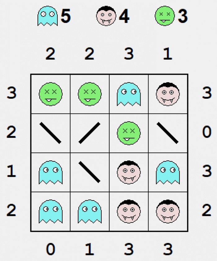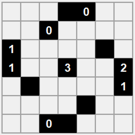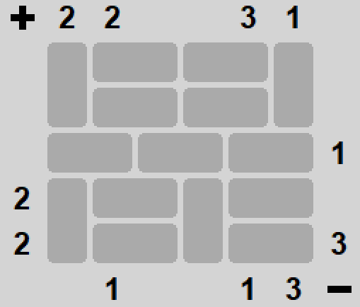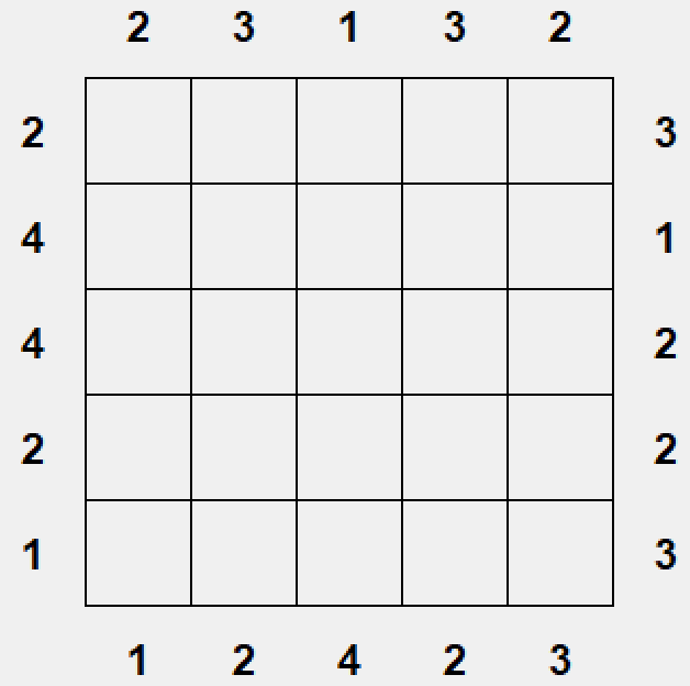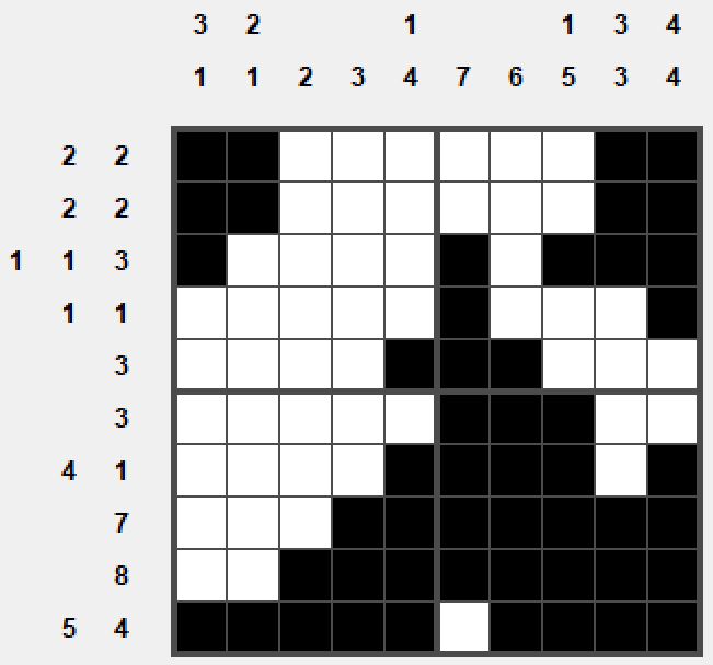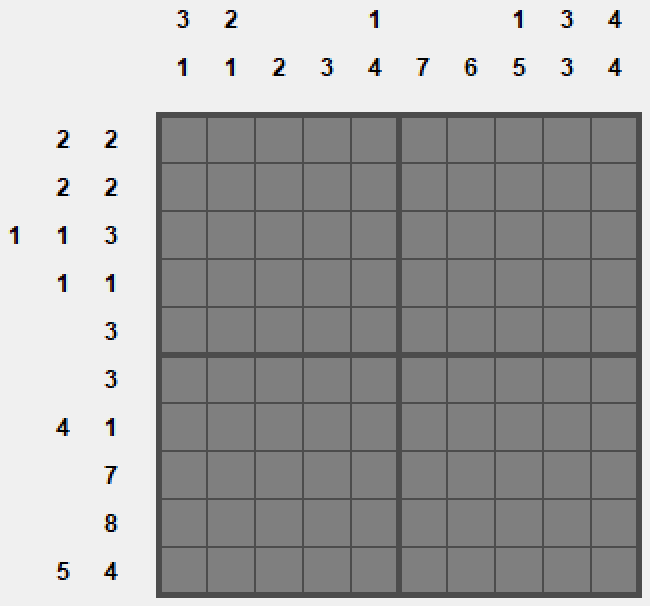 Wzór to gra dość popularna; widziałem kilka jej klonów tu i tam. Na kwadratowej planszy umieszczone są czarne kwadraty; naszym zadaniem jest ich zlokalizowanie. Wzdłuż wierszy i kolumn mamy podane informacje o tym ile grup kwadratów każdy wiersz / kolumna zawierają oraz jakiej wielkości są te grupy. Przykładowo jeżeli przy wierszu są liczby 3, 4, 1 to znaczy że jest w tym wierszu grupa trzech kwadratów potem przerwa (nie wiadomo jak długa) potem grupa czterech kwadratów, potem znów przerwa i jeszcze pojedynczy kwadrat na końcu.