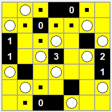 Zapalanie lampek. Na kwadratowej planszy podzielonej na kwadratowe pola mamy trochę pól białych i trochę czarnych. Na niektórych czarnych polach znajdują się liczby. Naszym celem jest poustawianie na białych polach lampek. Każda lampka oświetla pole na którym stoi oraz zawierające je wiersz oraz kolumnę - ale tylko do napotkania pierwszego czarnego pola w wierszu lub kolumnie. Lampki nie mogą się nawzajem "widzieć" (coś jak w zagadce o ośmiu hetmanach), dodatkowo obok każdego czarnego pola z liczbą musi stać dokładnie tyle lampek, ile mówi ta liczba.