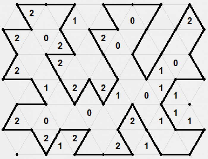 Pętelki to gra identyczna z opisywaną tu kiedyś przeze mnie Slitherlink. Trzeba zbudować zamkniętą pętlę wzdłuż krawędzi pól w taki sposób, żeby liczba segmentów pętli sąsiadujących z polami ponumerowanymi zgadzała się z tymi numerami. Pola mogą być trójątne, kwadratowe, sześciokątne, romboidalne i tak dalej - a więc jest to miła odsapka od wszechobecnych w tym wpisie kwadratów 🙂