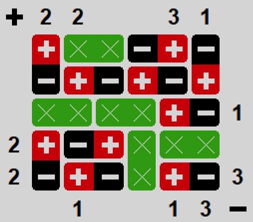 Domino magnetyczne jest nieco podobne do opisywanej powyżej Dominosa (punkt #4), tylko zamiast klasycznych domin mamy magnetyczne (a więc plus z jednej, minus z drugiej) oraz neutralne. Znamy ułożenie domin, ponadto na krawędziach planszy mamy podpowiedzi mówiące nam ile plusów oraz minusów znajduje się w każdej kolumnie i wierszu. Celem gry jest ustalenie które pola są ujemne, które dodatnie a które neutralne.