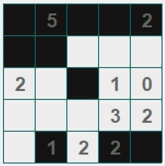 Zakres to gra, w której na kwadratowej (bądź prostokątnej) planszy musimy ustalić które pola są czarne a które białe. Za podpowiedzi mamy umieszczone na niektórych polach liczby. Te liczby mówią nam ile białych pól "widać" z danego pola - przy czym chodzi o łączną liczbę wszystkich białych pól między polem z liczbą a najbliższym czarnym polem (lub krawędzią planszy). Dodatkowo czarne kwadraty nie mogą się ze sobą stykać krawędziami (narożniki są ok), wreszcie ostatni warunek jest taki, że wszystkie białe pola w rozwiązaniu muszą utworzyć pojedynczy kształt połączony krawędziami (nie można rozdzielać białych obszarów na mniejsze kawałki).
