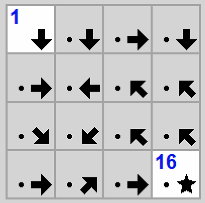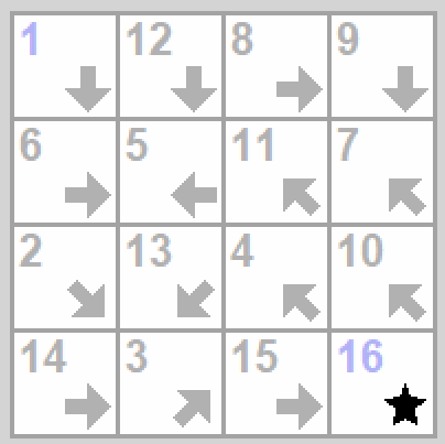 Drogowskazy to chyba moja ulubiona gra z tego zestawu. Na dzień dobry dostajemy planszę ze strzałkami. Naszym celem jest ustalenie numeru każdego pola, przy czym strzałki zawsze wskazują na pole o jeden numer większe od tego ze strzałką (niekoniecznie sąsiadującego - strzałka przy lewej krawędzi planszy może wskazywać na pole przy prawej krawędzi). Strzałki mogą kierować się w jeden z ośmiu kierunków (S, N, E, W i cztery pośrednie). Pole startowe (z jedynką) oraz końcowe (na przykład z szesnastką w przypadku planszy 4x4) są już zaznaczone. Jeżeli rozwiązanie danej planszy byłoby niejednoznaczne, gra odkrywa czasem na początku dodatkowe numery aby mieć pewność, że planszę da się rozwiązać dokładnie na jeden sposób.