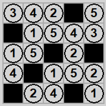 Single to krzyżówka Range (patrz numer 25 powyżej) z Sudoku. Tutaj też musimy ustalić lokalizację wszystkich czarnych kwadratów, które ze sobą nie sąsiadują (stykanie się narożnikami jest ok), a wszystkie białe kwadraty muszą się ze sobą łączyć. Różnica polega na tym, że na dzień dobry ponumerowane są wszystkie pola planszy, ustawienie czarnego kwadratu usuwa liczbę - na koniec musimy doprowadzić do sytuacji, w której każdy wiersz i kolumna zawierają unikalne liczby.