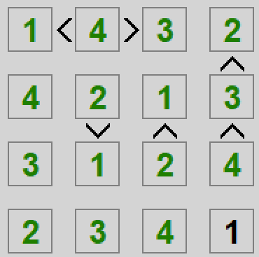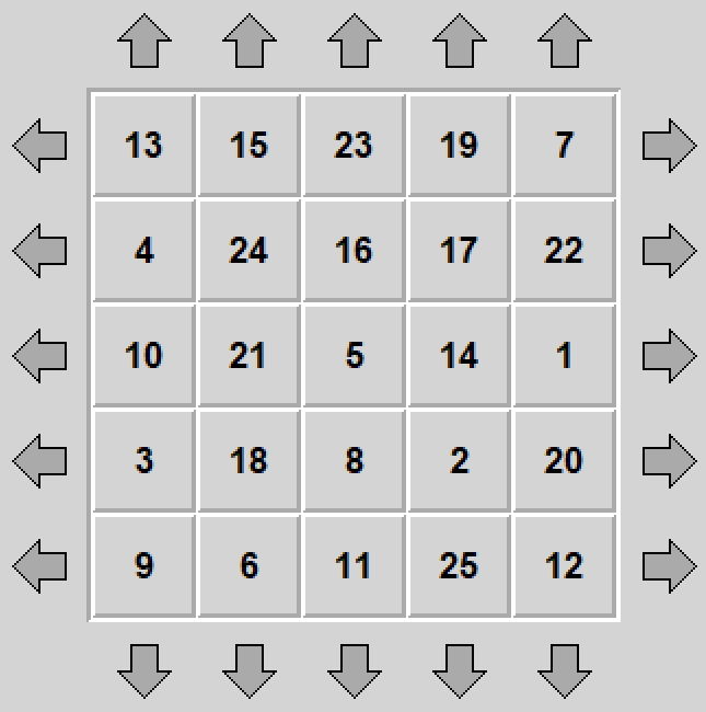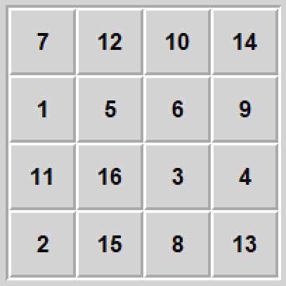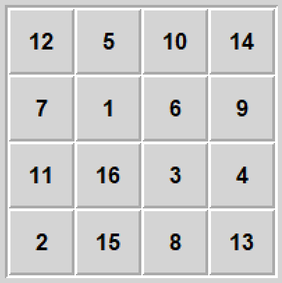 Szesnastka jest nieco podobna do piętnastki (patrz numer 5 powyżej) tylko zamiast przesuwania dziury po kwadracie tutaj przesuwamy całe wiersze lub kolumny po torusie.