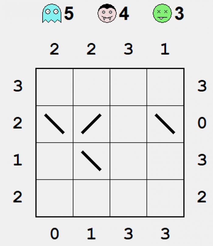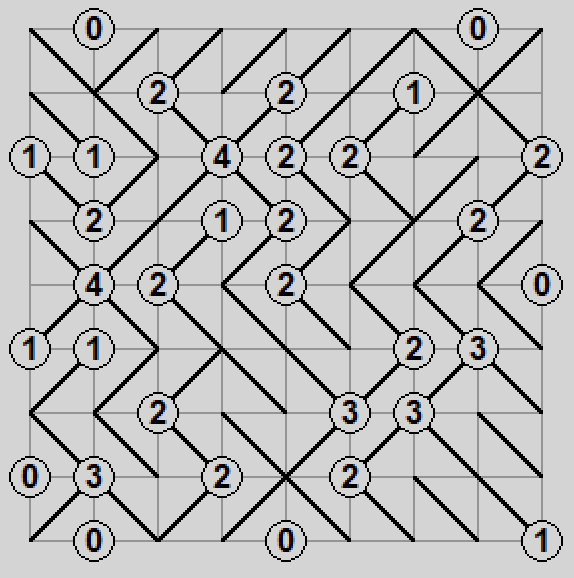 Ukośnik to jedna z moich ulubionych gier w tym zestawie. Celem gry jest rozrysowanie przekątnych wszystkich pól na kwadratowej planszy. Umieszczone na skrzyżowaniach krawędzi liczby w kółkach mówią ile przekątnych dotyka do danego kółka. Ponadto końcowe rozwiązanie nie może zawierać pętli.
