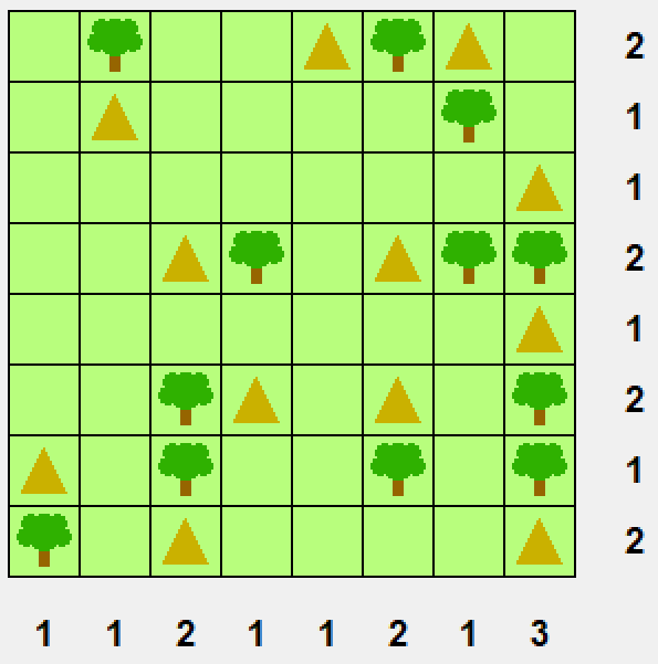 Namioty to gra, w której musimy porozstawiać namioty w lesie. Na początku gry mamy tylko las. Koło każdego namiotu musi stać drzewo. Dwa namioty nie mogą ze sobą sąsiadować. Liczba namiotów w rozwiązaniu musi być równa liczbie drzew. Liczby namiotów w poszczególnych wierszach i kolumnach muszą się zgadzać z podpowiedziami na obwodzie planszy.