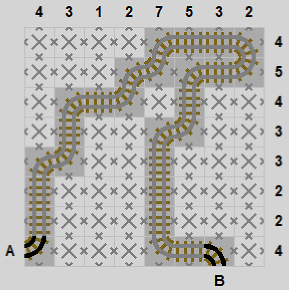 Tory kolejowe to jeszcze jedna gra odrobinę kojarząca się z PipeManią - musimy poprowadzić tory kolejowe od stacji początkowej do końcowej. Przez każde pole planszy może iść albo tor prosty, albo zakręcający o 90 stopni. Ponadto liczby segmentów torów w każdej kolumnie i wierszu są podane w podpowiedziach na krawędzi planszy. Tory nie mogę się przecinać.